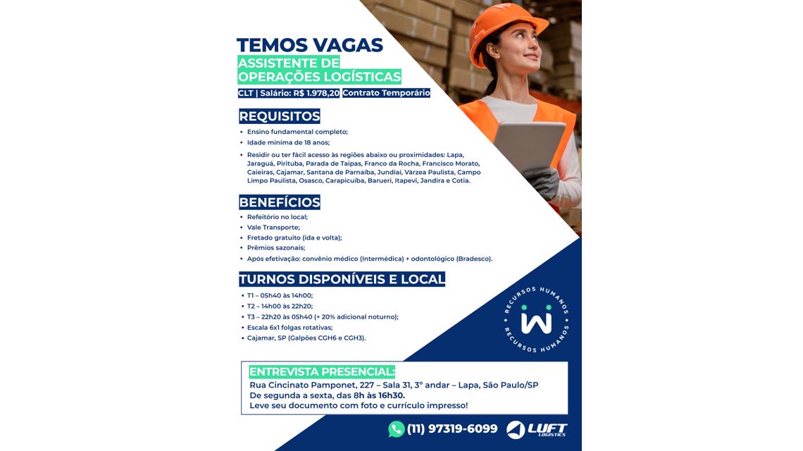 ?? OPORTUNIDADE TEMPORÁRIA – ASSISTENTE DE OPERAÇÕES LOGÍSTICAS | PROLOGIS II (CAJAMAR/SP)